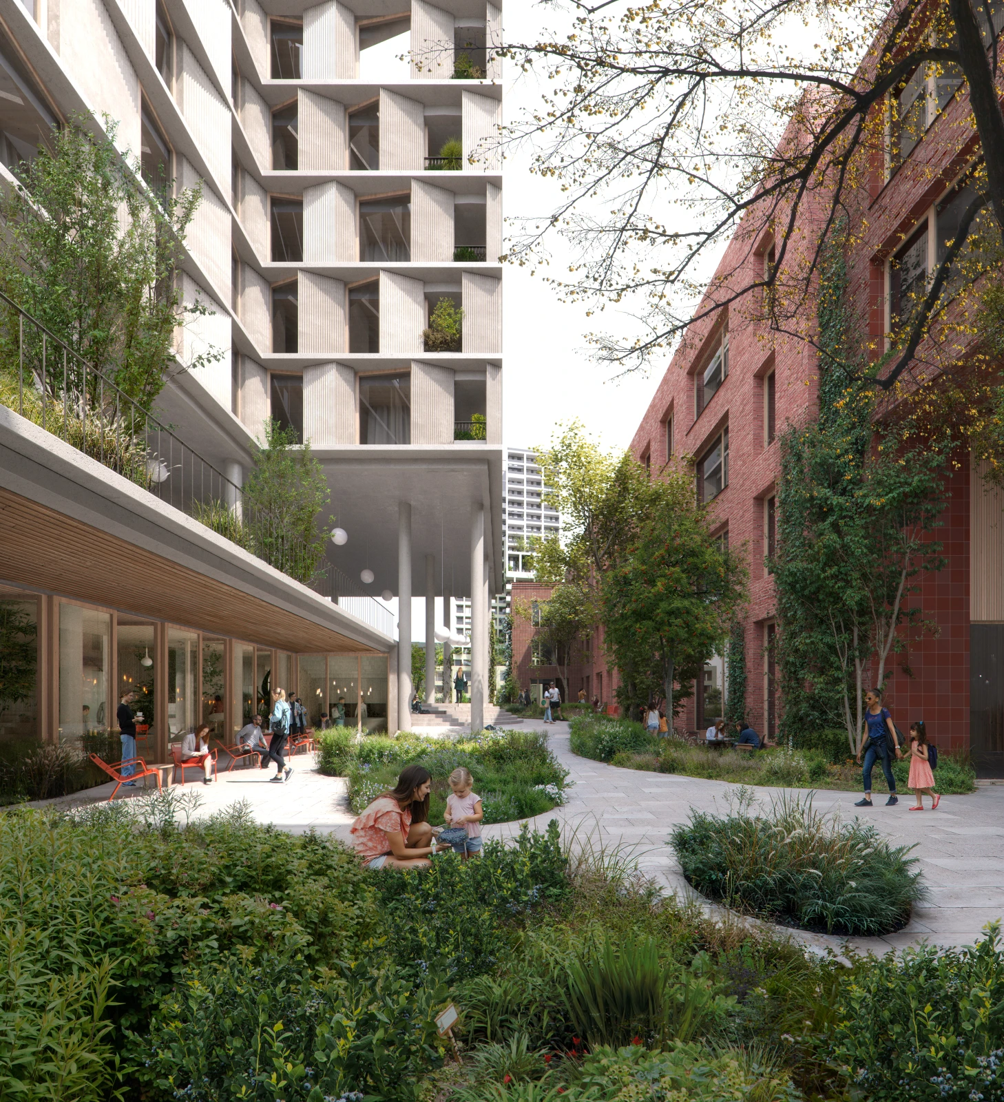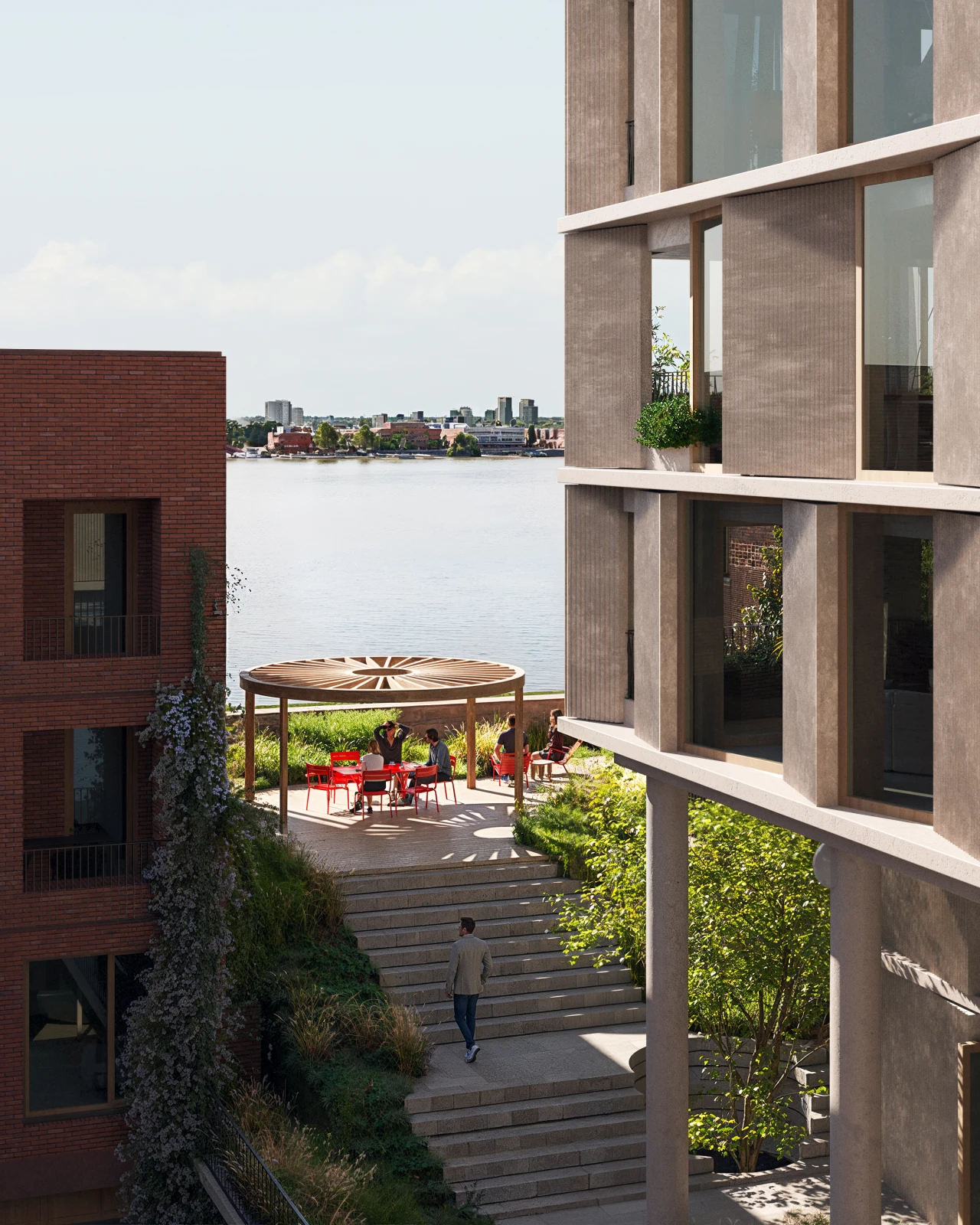 In dit project is de natuur een groene schakel. Een doorlopende groenzone sluit aan op de dijk, slingert via de margestrook dwars door het gebouw en eindigt bij de gracht met het plantsoen. In het hart van het plan ligt een gemeenschappelijke binnentuin – een groene oase midden in de stad. Hier is ruimte om te ontspannen, te bewegen en samen te komen gedurende de dag. Zo verbindt SunSet stedelijke ontwikkeling met natuurlijke beleving en gemeenschapszin.
