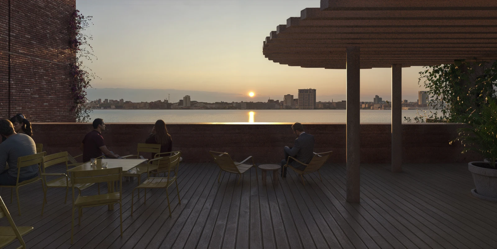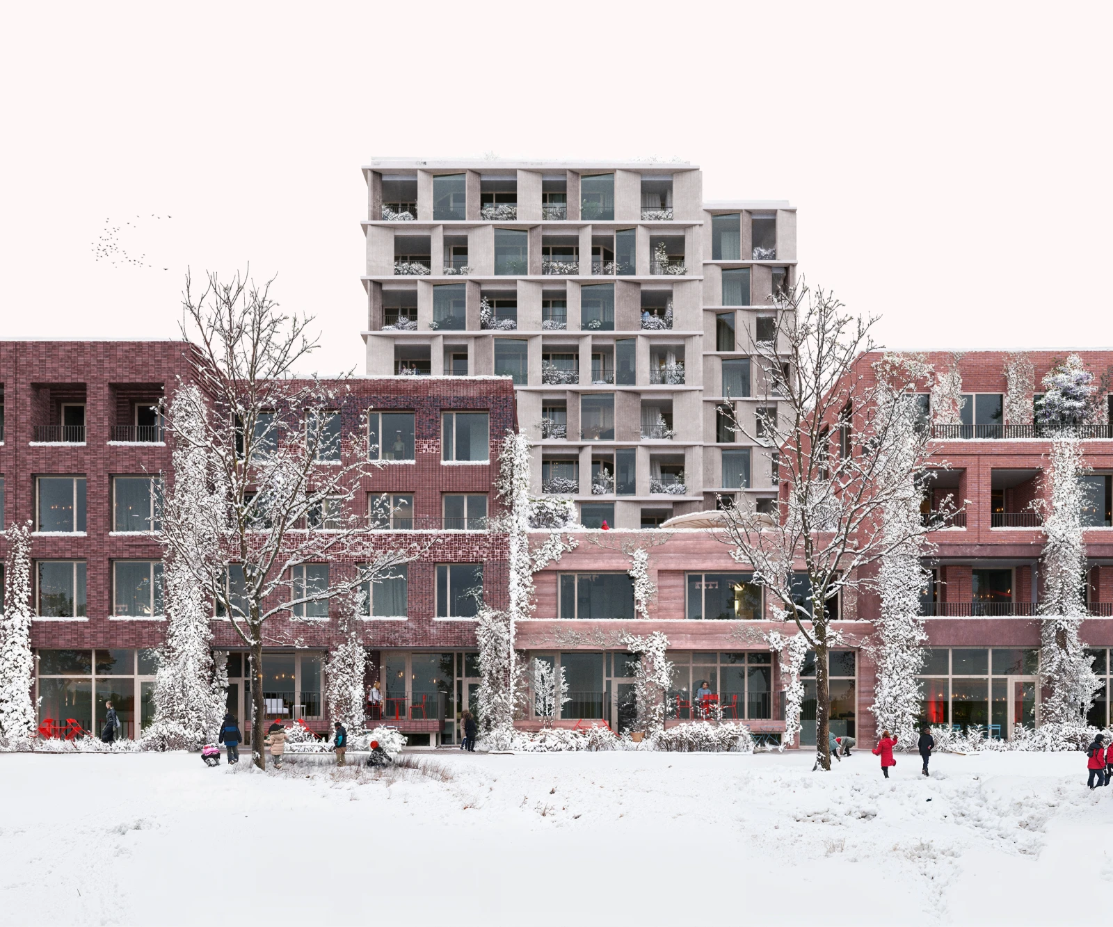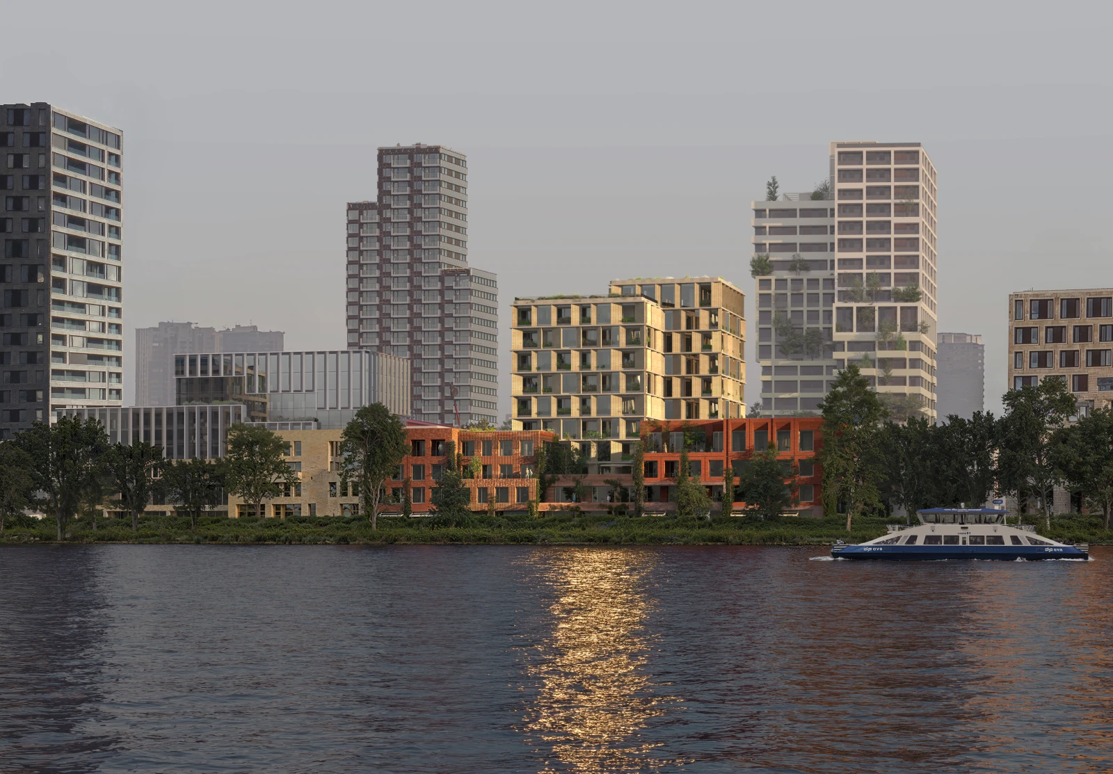 De Sluisbuurt is nog voornamelijk een zandvlakte, waar de contouren van de toekomst langzaam zichtbaar worden. In de komende jaren transformeert dit gebied tot een levendige stadswijk. Hier verrijst SunSet: twee horizontaal geschakelde, opgetilde torens met een uitgesproken onderbouw – een visueel ankerpunt in de opkomende skyline. Het getrapte silhouet voegt zich vanzelfsprekend naar de stedenbouwkundige context van de Sluisbuurt.
